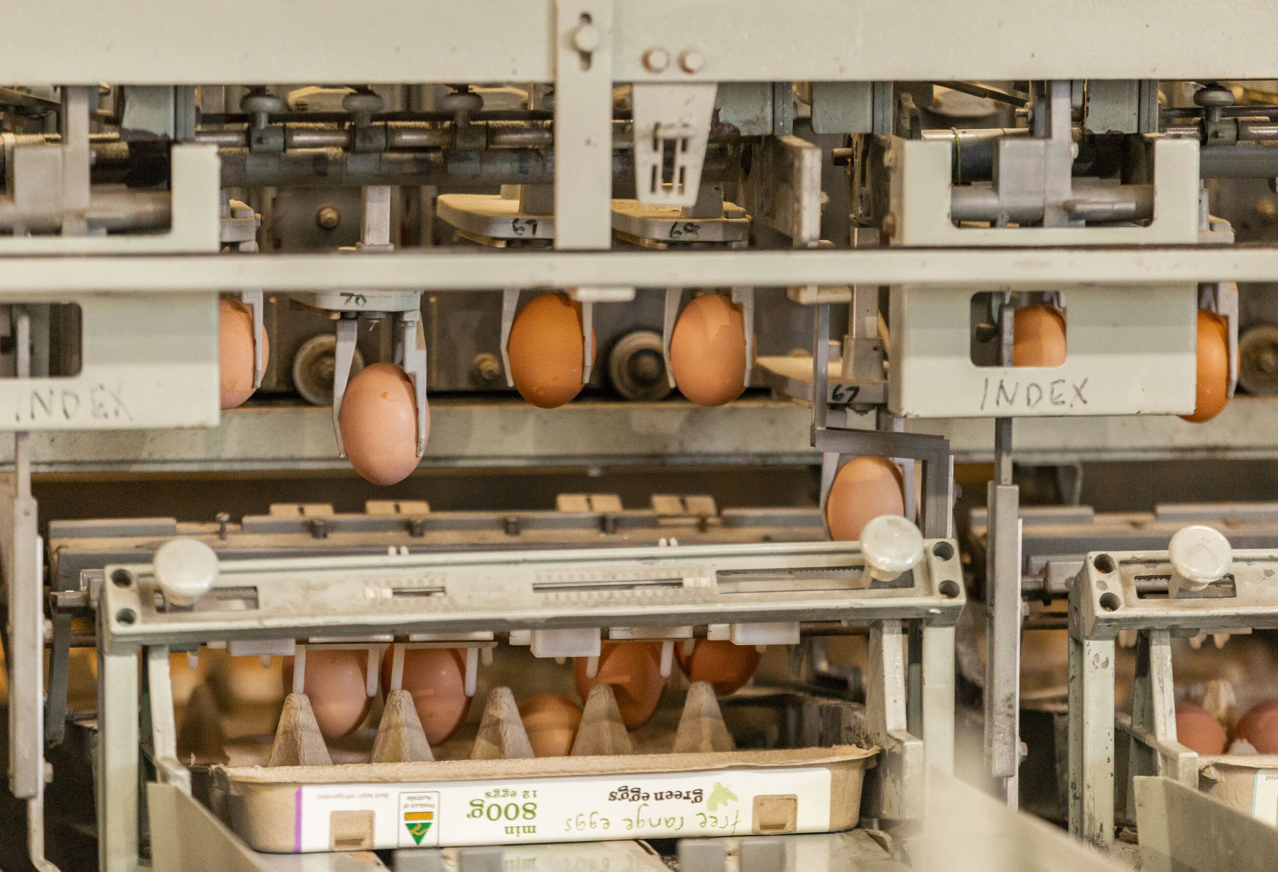 The eggs are organised by weight, and placed into the cartons. This ensures the customer received a consistently sized eggs.